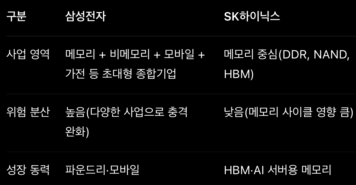 ➡️ 요약: 삼성은 “성장 탄력성”, 하이닉스는 “변동성”이 리스크 포인트.