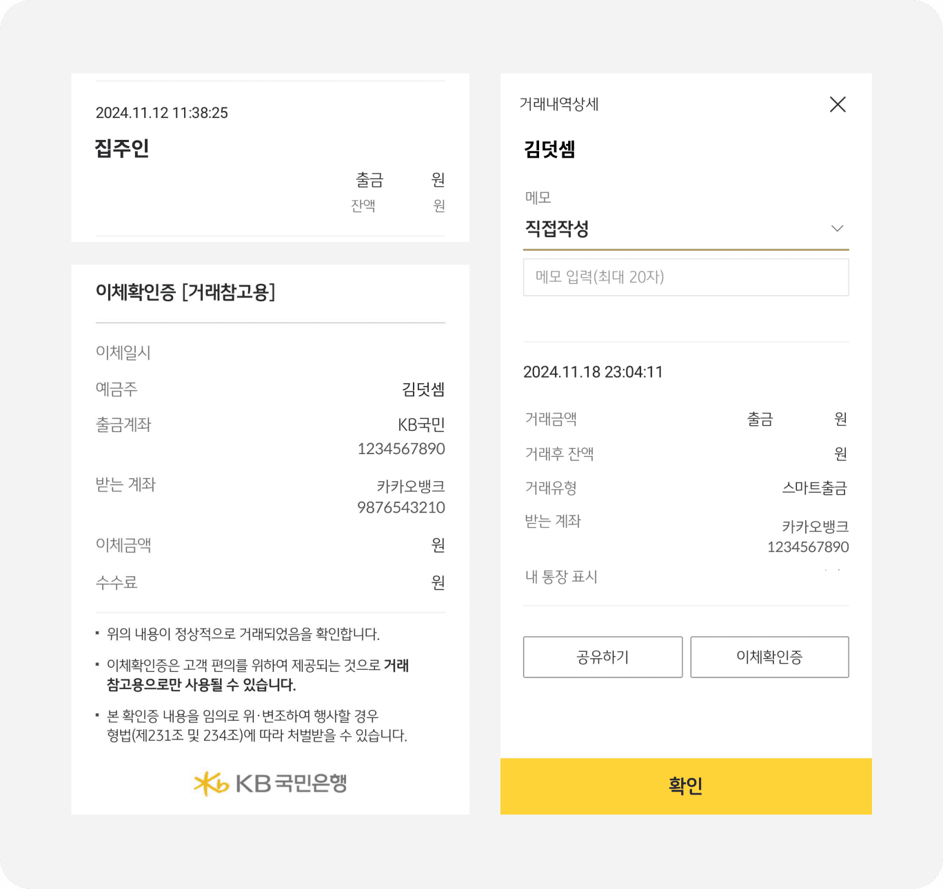 - 계좌이체 내역, 자동이체 기록 등