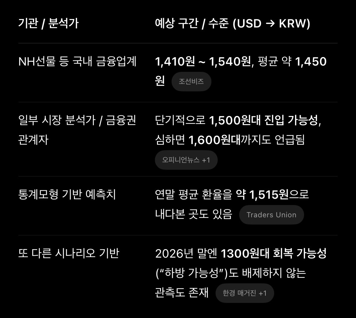 ✅ 정리하면: 1,400원대 초중반(≈1,410~1,460원) 이 ‘기준 시나리오’로 가장 많이 보이고,