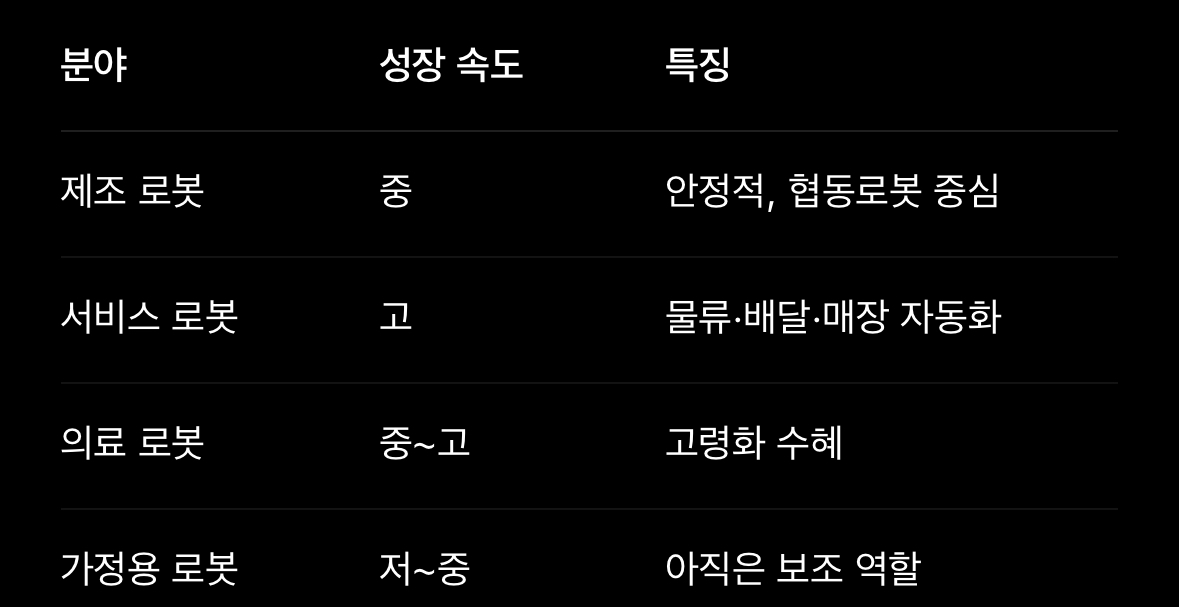 제조 로봇은 성장 속도는 완만하지만, 안정성과 규모 면에서는 여전히 핵심입니다.